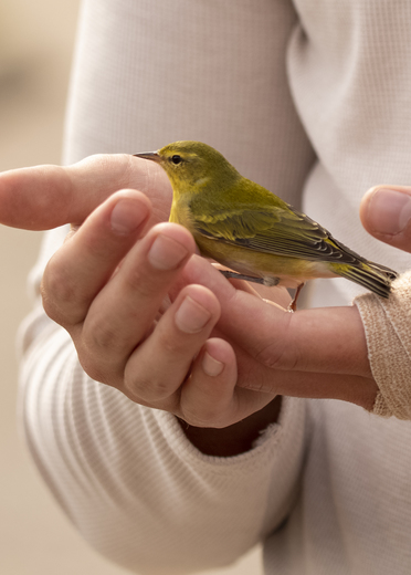 My son cradles this little Warbler that just landed on him as he stood in the yard. He eventually seemed OK and flew away.