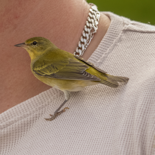 This little Warbler took a shining to my son as he landed on him in the yard and stuck around for a while