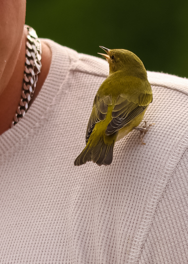 After landing on and crawling all over my son as he stood in the yard this little Warbler worked his way up to his shoulder and eventually flew away