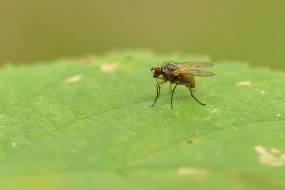 The size of this fly is quite apparent when you can see the fine hairs on the leaf as a comparison.