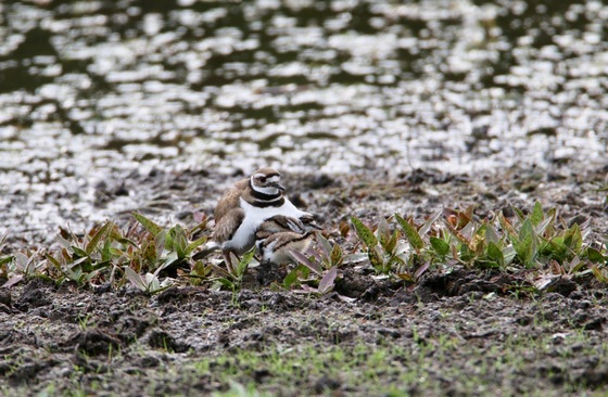 Three Killdeer chicks run to safety under the mother,. I think it was more to get out of the rain.