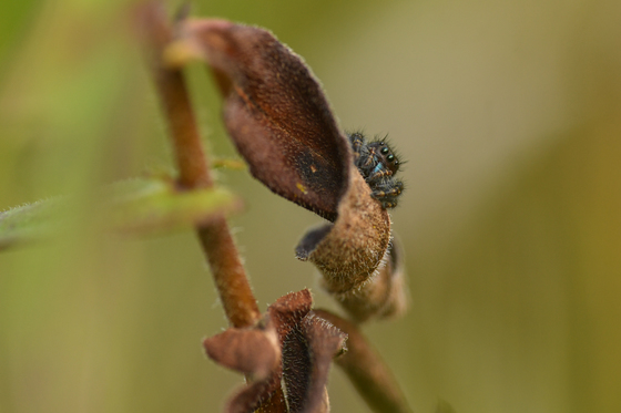 This jumping spider was patiently waiting near some flowers in the hope that an unsuspecting fly might come within range