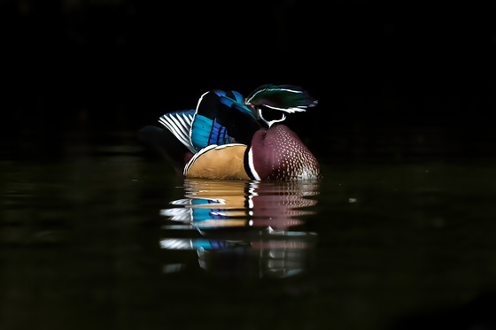 Male wood duck preening feathers among beautifully dark shadows