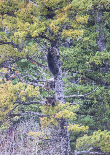 Grizzly cubs playing in a conifer