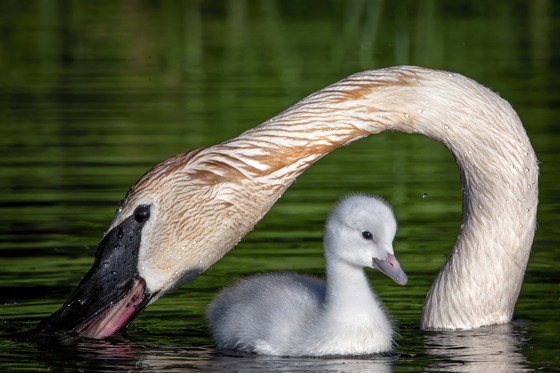 Trumpeter swan cygnet only a week old so staying very close to its parents to feel safe.