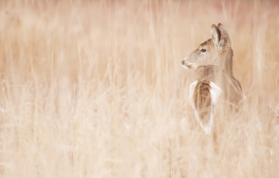 A Whitetail Deer stands in a meadow full of dry grass in soft morning sunlight. Clearly something has caught its attention as it stares intently into the distance.