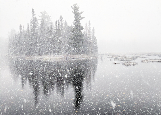 Walking through Algonquin Park, Ontario on a bright November afternoon, I could see a bnk of dark clouds rolling towards me. Within what felt like only a few minutes the clouds unleashed a blizzard that changed the seasons from autumn to winter right before my eyes.