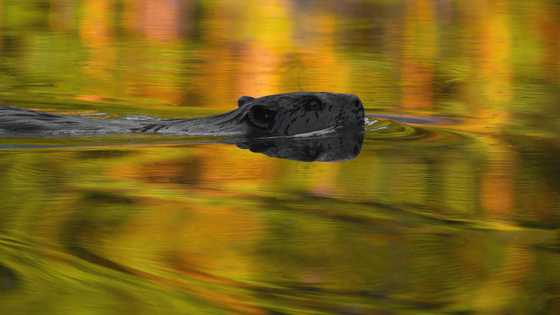Early morning light reflecting from the surrounding shoreline across the water surrounded this beaver in vibrant colour.