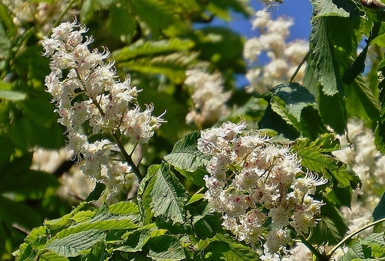 Chestnut tree blooms basking in the sun on a clear blue sky Spring day.