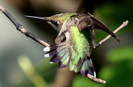 A Ruby-throated Hummingbird is busy preening himself on a branch.