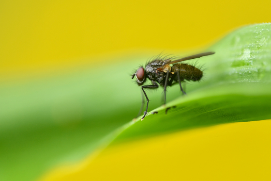 What caught my eye when I photographed this fly was the brightness of having yellow flowers contrasting the dark fly and leaf on which it stood.