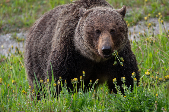 A bear in Lake Louise, Alberta, eating some dandelions by the side of the road. He stayed a few minutes before being scared off by the park rangers.