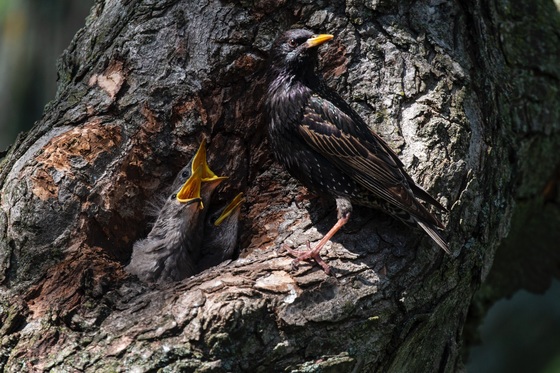 A European Starling pauses for a moment before returning to get food for her three young. She returned to the nest every few minutes throughout the entire day, and her young hardly ever stopped screaming for her. I set up my tripod and waited patiently for her return along with the baby birds.