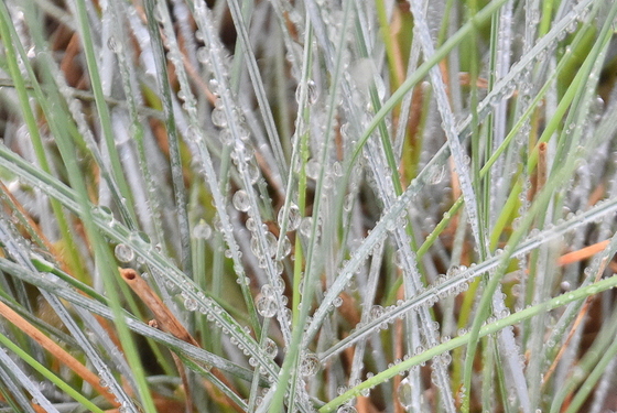 After a foggy night, the morning leaves dew on the ornamental grasses.