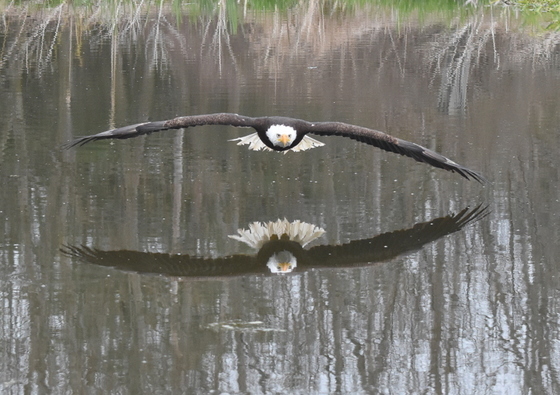 This Bald Eagle glides over a pond at the Canadian Raptor Conservancy, in Ontario.