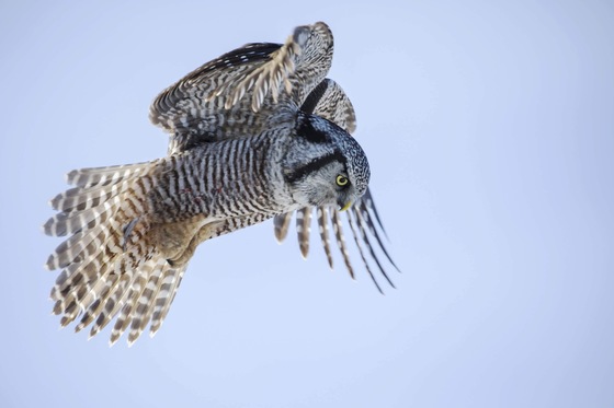 This gorgeous owl is a Hawk Owl. It normally lives in the Boreal Mountains uo North, but it decided to come south this year, it must have heard we have lots of voles in this part of Ontario. Here he is seconds before diving to catch his dinner.