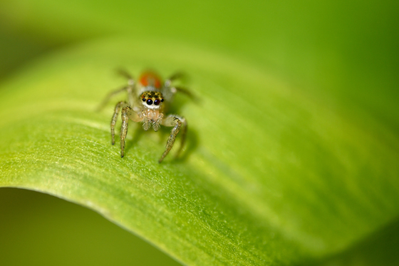 This jumping spider's territory seemed to encompass 1-2 Hosta plants and was constantly on the search for food by stopping on each Hosta leaf and watching for movement of an unsuspecting fly.