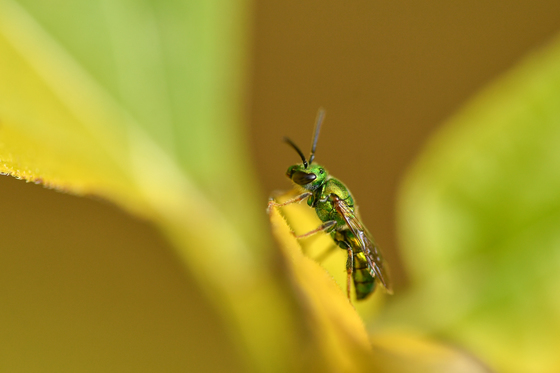 Towards the latter part of fall, whatever remaining flowers are a strong attractant for these Metallic bees. This one is taking a short rest to warm itself on the leaf of a Hosta plant.