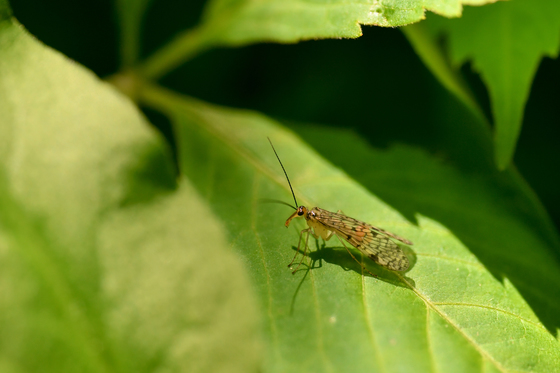 While out on a walk I noticed a number of these Scorpionflies in the heavily shaded woods. The challenge to was find one that would land on a leaf in the sun so I could photograph it. This one complied!