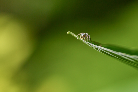 This jumping spider seems to be considering its next move as it peers over a leaf which was a considerable height above the next level of plants below.