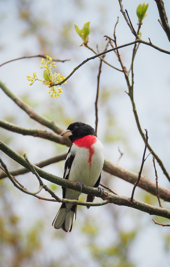 A Rose-breasted Groabeak taking a rest during spring migration. The flowers on the trees just beginning to bloom