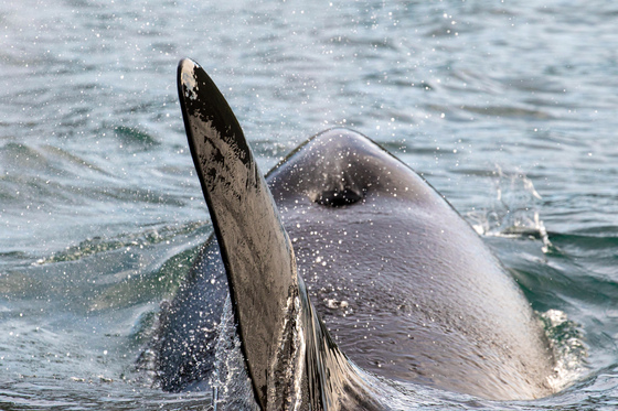 A Male orca breaches the surface