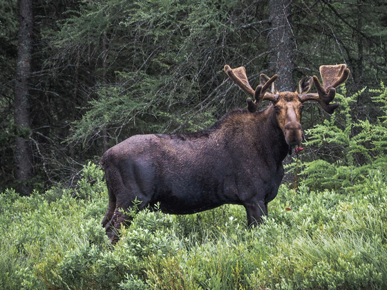 Bull moose feeding along the river