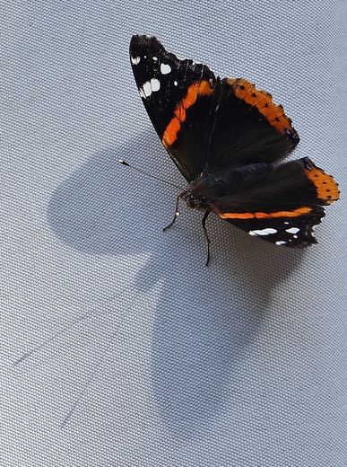 Red Admiral Butterfly on my outdoor umbrella basking in the sun.