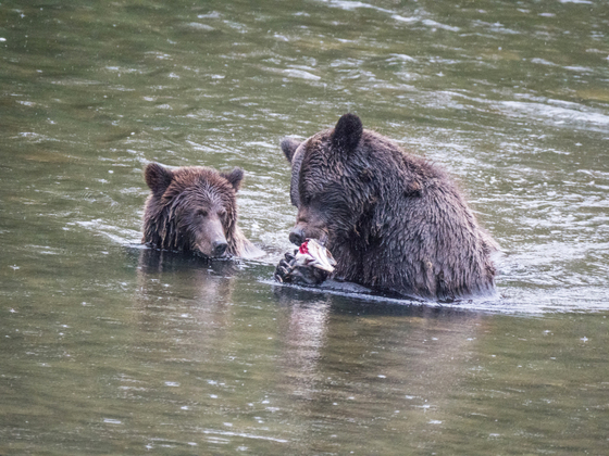 Mom showing cub how to catch salmon