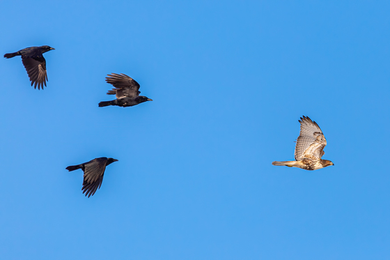 A bunch of crows pestering a red tailed hawk near Ottawa