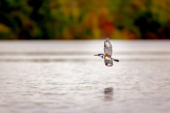 Belted Kingfisher flying up the Rideau River with the Autumn colors in the background