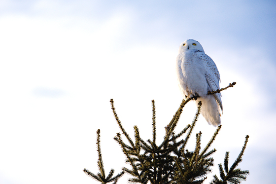 Snowy owl perched in a tree, looking majestic at it stares into the later afternoon sun.