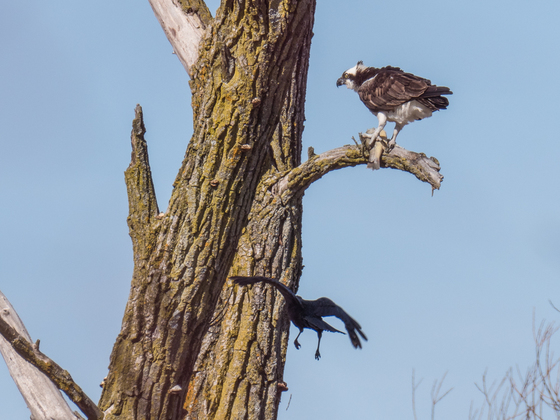 The Osprey flew up into the tree with its fish and was eating it. A crow flew up into the tree to harass the Osprey.