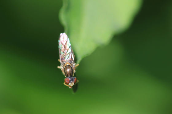 Macrophotography of a Syrphid fly turning her head at 180 degrees showing her mouth and back at the same time