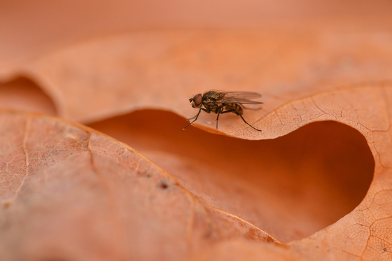In late fall, I saw this fly was resting on the edge of a dead leaf which looked like the entrance to cave.