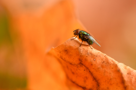 The light shining through the dead leaf provided an interesting glow to the calliphorid fly.