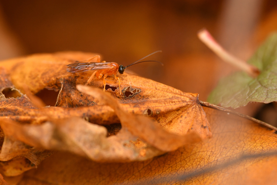 This Ichneumonid wasp was almost perfectly camouflaged with the dead leaf.