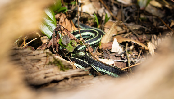 I heard a slight rustle in the bushes but it took a while to find the culprit. I peeked over the broken off end of a hollow log and there it was, this beautiful garter snake giving me a curious, but also a "what are you doing in my house" kind of stare.