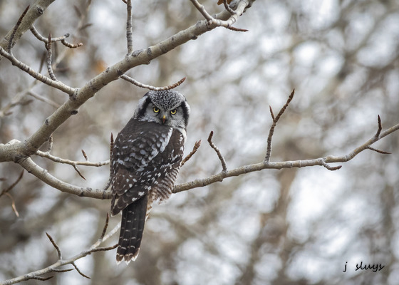 On a rather cloudy day I went for a walk in the forested area on the west side of town looking for a Stellar Jay that was reported to of been in the area . I came across a lot of other birds but no Stellar and then a noisy commotion caught my attention and it turned out that a number of Northern Flickers , Blue jays and a northern Flicker were harassing this beautiful Northern Hawk Owl and chasing it all over the area I was in . After about 30minutes they left him alone and he went back to hunting mice . The time spent with this beauty will be something I will never forget .