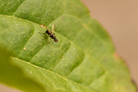 This diminutive size of this fly is quite apparent when compared to the hairs on the leaf.