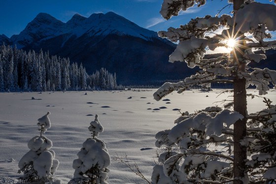 Sun peeks through tree branches on sunny, albeit chilly day, after fresh snowfall in Kananaskis