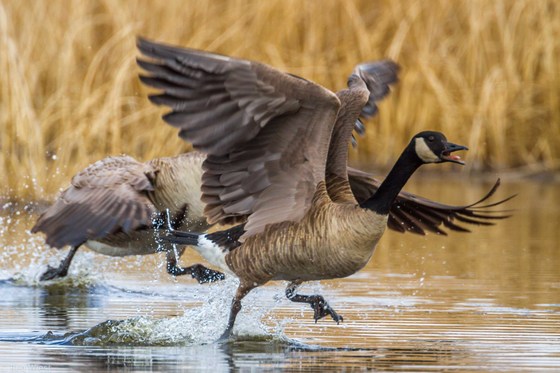 Canada geese spring into action at Frank Lake near High River, Alberta