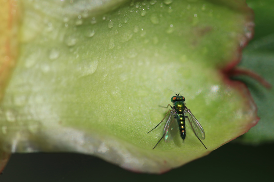 Macrophotography of a tiny fly on a leaf.