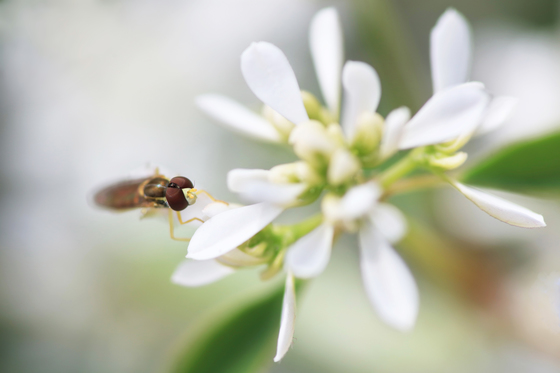 Macrophotography of a Syrphid fly on a white flower.
