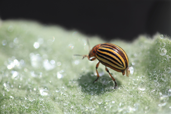 Macrophotography of a flying bug on a wet leaf.