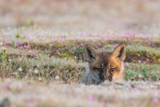This young fox kit peering from the den opening.