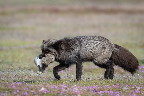 This fox mother returns with two rabbits to feed her hungry youngsters.