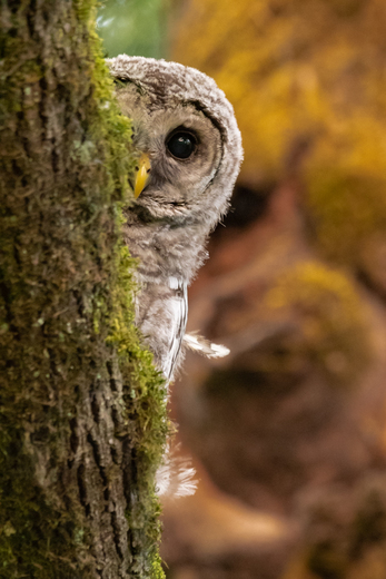 A Barred Owlet peers out from behind the tree limb.