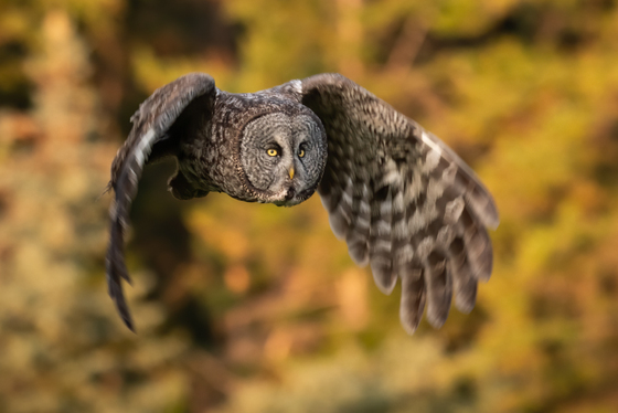 A Great Gray Owl flies low between perches.