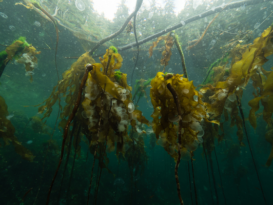 A view of the boreal forest from below water in a kelp forest. This is shot in Hoody Nudie Bay in God's Pocket Provincial Park.